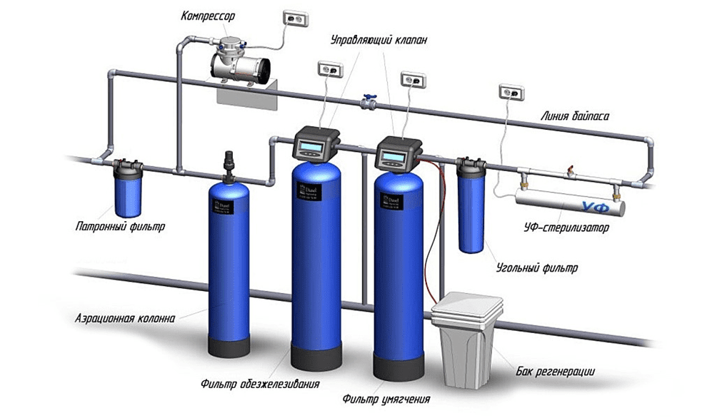 Устройство системы очистки воды предусматривает наличие следующих компонентов: