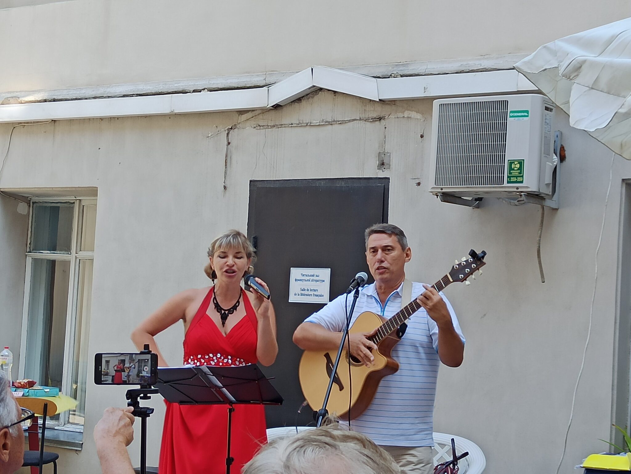 Теплая пятница во дворе библиотеки запомнилась еще и музыкальными номерами в исполнении дуэта Виолетты Лашкул (вокал) и Сергея Никитченко. Участники литературного праздника услышали веселые песни о Затоке и Лебедевке, о бакланах и чайках. Красоте тексту песни добавили слова, которых нет в словарях: саламурить (от саламур — специальный острый соус, который подают к ухе), деликатесить.