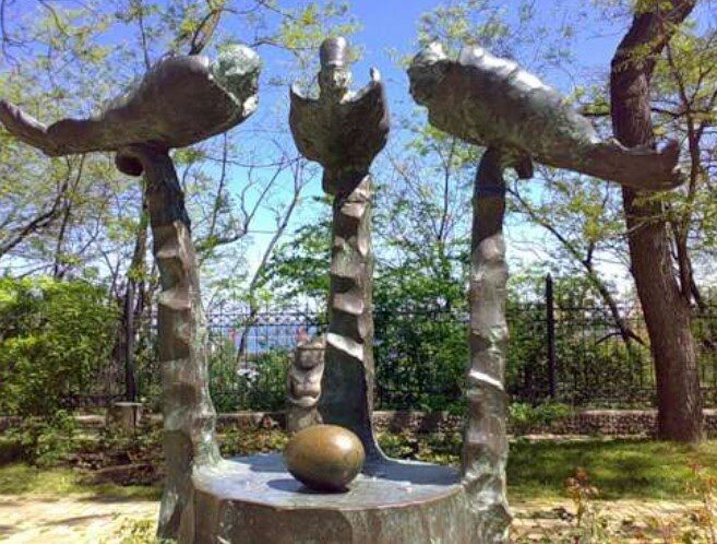 Одеський літературний музей, а точніше його двір, має незвичайну скульптуру, дивлячись на яку, ви обов’язково помітите яйце, яке знаходиться під охороною трьох птахів , що мають голови легендарних геніїв, якими є Олександр Пушкін, Ісаак Бабель і Микола Гоголь.